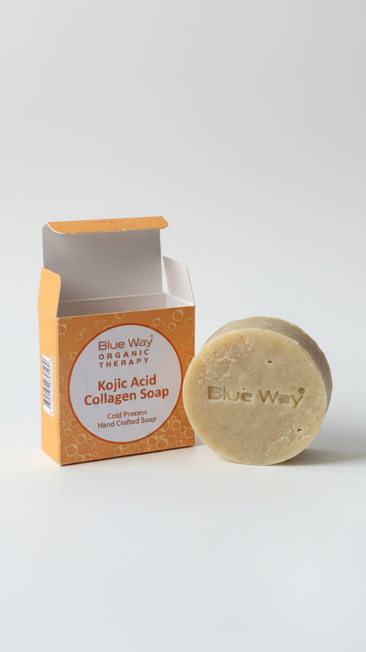 Blue Way Organik Terapi Kojik Asit ve Kolajen sabunu, içeriğindeki Kolajen, Hyaluronik Asit ve Kojik Asit aktifleri sayesinde akne önleyici, aydınlatıcı ve yaşlanma karşıtı etki sağlar.