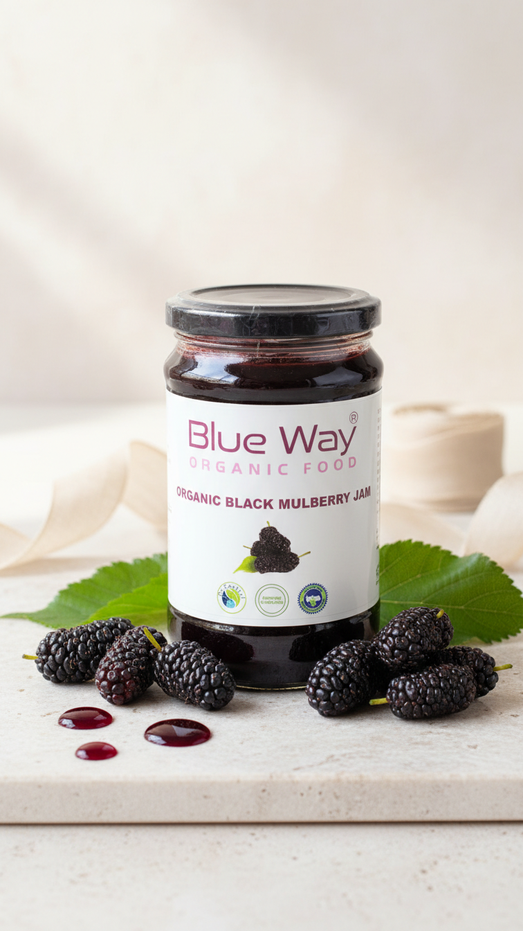 Özenle seçilmiş %100 organik karadut ve incirler, BlueWay farkıyla bir araya gelerek doğal ve besleyici bir marmelata dönüştü.
